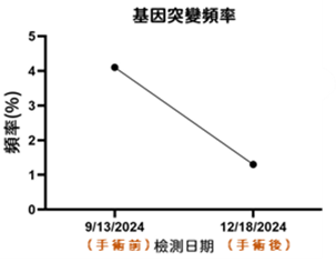 • 相比手術前的檢測結果,變異基因數量減少為一個,且突變頻率下降,但仍呈現陽性結果。
